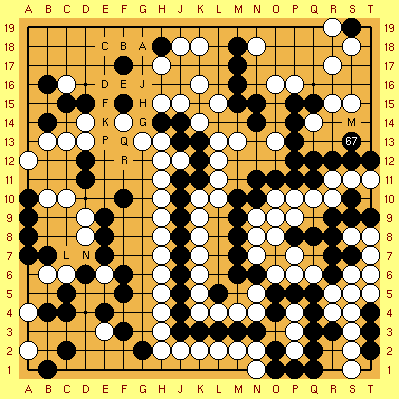 GREEN: The branch starting with this move ends good for BLACK. RED: The branch starting with this move ends good for WHITE. ROSE: The branch starting with this move ends probably good for WHITE (e. g. there are some deeper variations not investigated yet). YELLOW: The branch starting with this move ends with JIGO. CYAN: The branch starting with this move has not been investigated yet and / or the result is unclear. |
